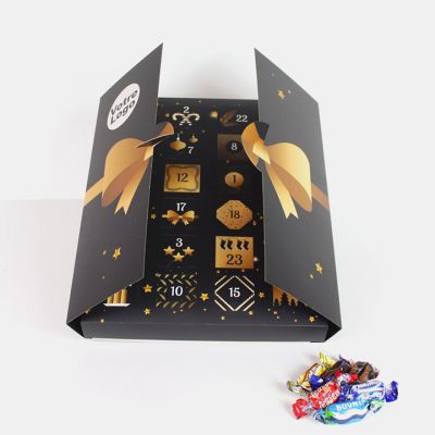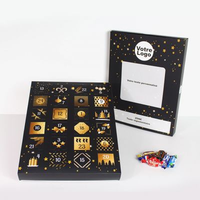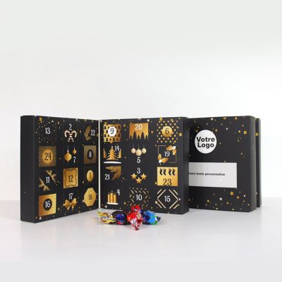 Vous apposez vos visuels, vos couleurs, vos messages afin de créer un calendrier de l'avent unique. Le calendrier devient un objet publicitaire élégant qui reste sur le bureau tout au long du mois de décembre, rappelant chaque jour l’attention de votre entreprise. Petit bonus : nous proposons des options de remplissage avec des chocolats, café ou thé.